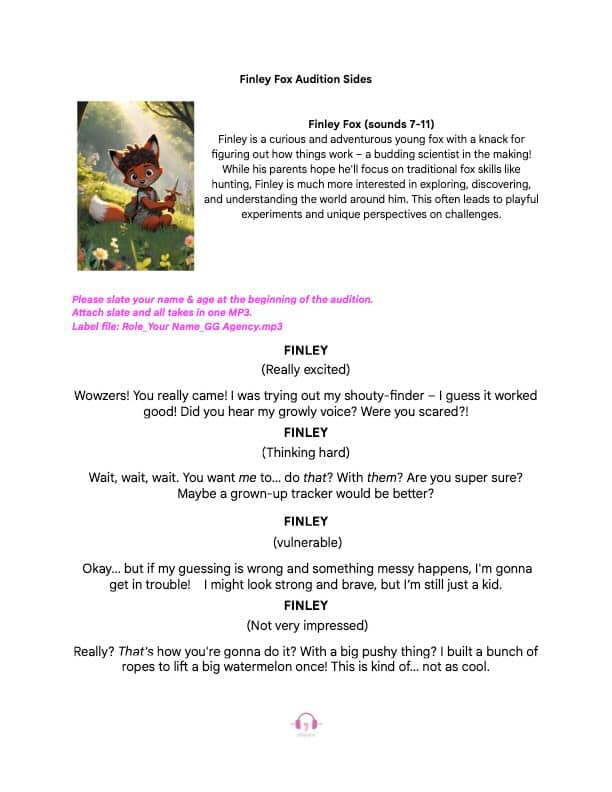 Want to try out your own voice acting roller coaster? 🎢 Grab the Finley Fox audition script! This free download is your ticket to practicing those "Agent-Ready" skills – slating, character decoding, and riding the emotional waves of a script. Enter your email to download the script and start your voice acting adventure today!